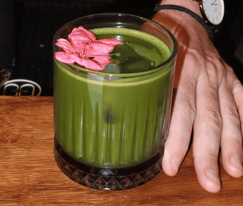 Japanese Bloom Gin • Rose • Lemon • Strawberry • Matcha Foam • Edible Flower. A fresh, floral taste of spring delicate botanicals, gentle sweetness, and a silky matcha crown.